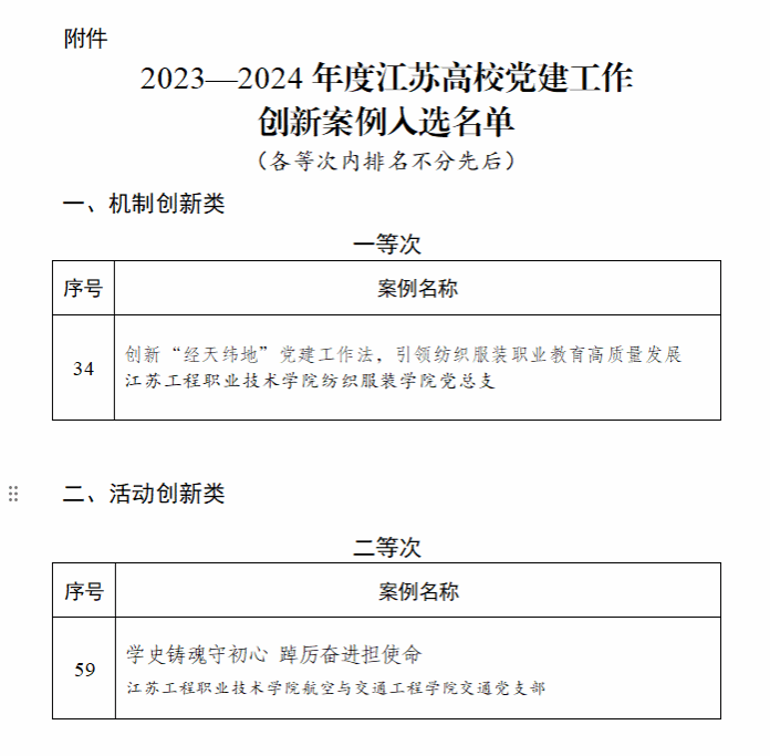 近日,省委教育工委公布了2023—2024年度江苏高校党建工作创新案例评选结果。我校推荐的纺织服装学院党总支《创新“经天纬地”党建工作法,引领纺织服装职业教育高质量发展》和航空与交通工程学院交通党支部的《“党建领航匠心传承路 接力赓续交通强国梦”主题党日活动》分别从全省近200多个案例中脱颖而出,荣获机制创新类一等次和活动创新类二等次,取得新突破。