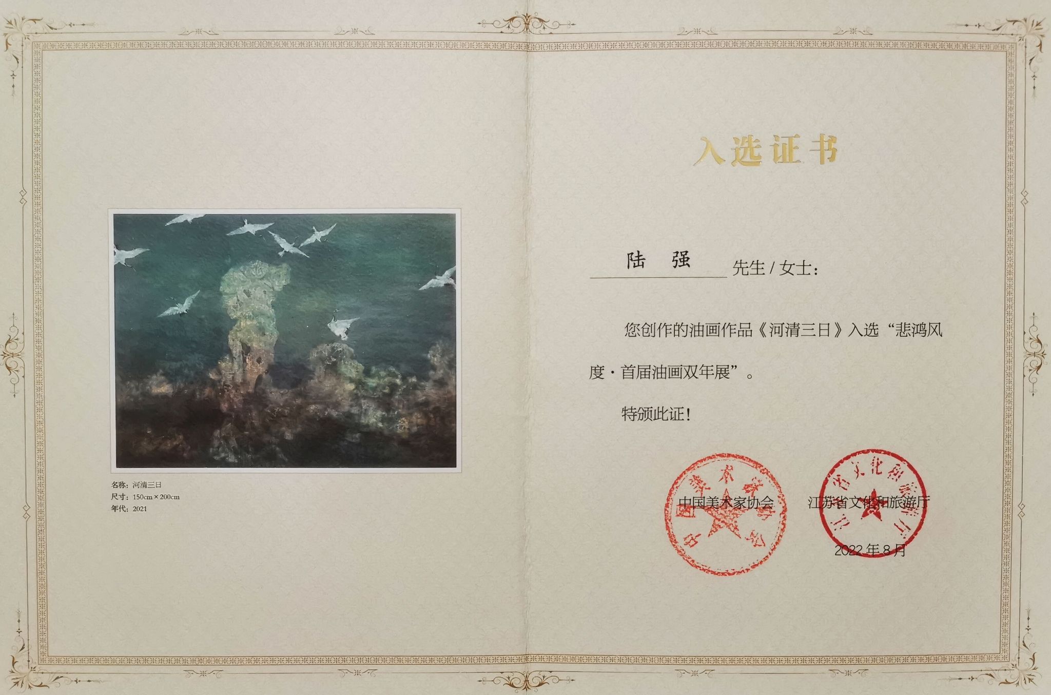 2022年8月,油画作品《河清三日》入选“悲鸿风度-首届油画双年展”(国家级)