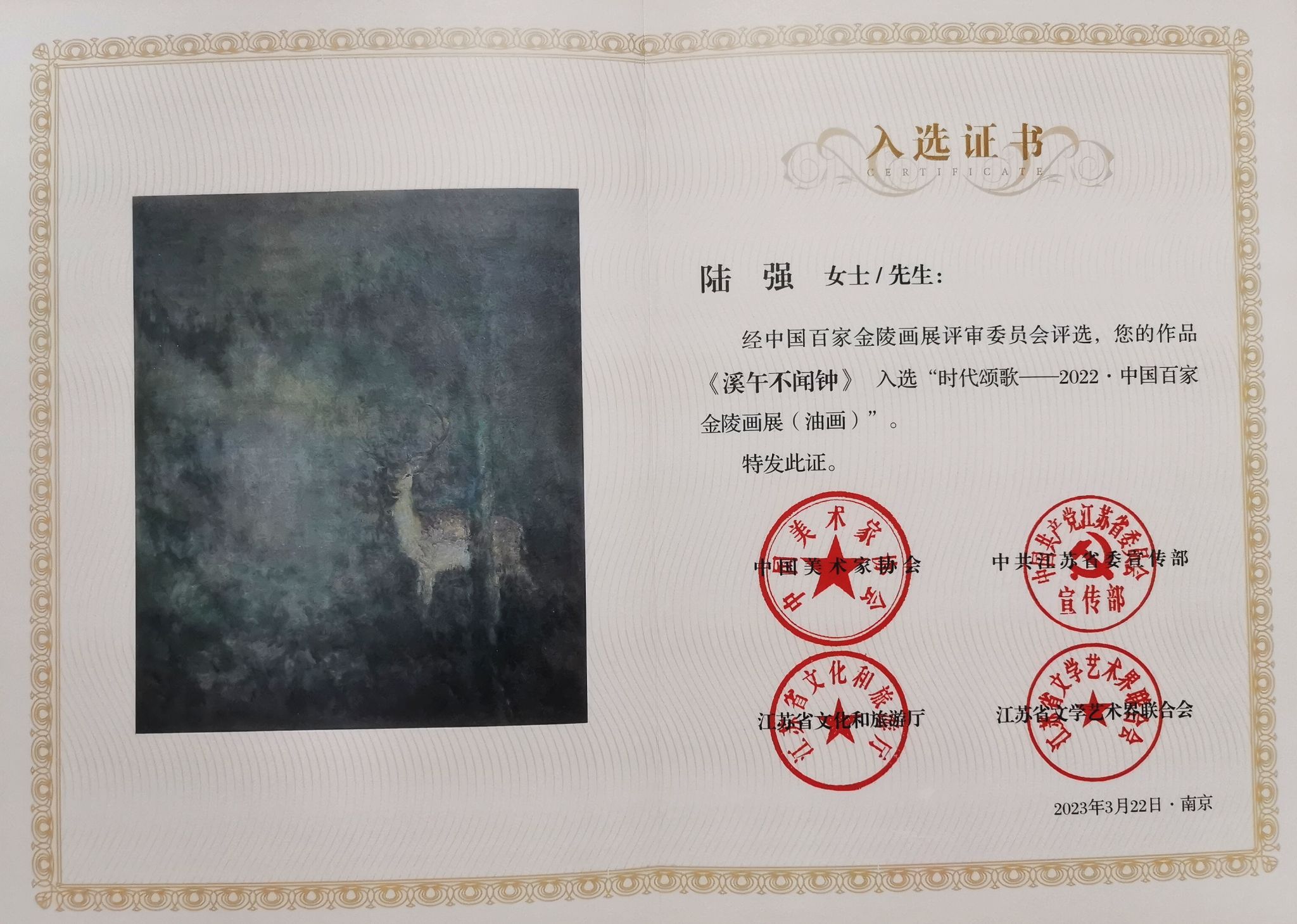 2023年3月,油画《溪午不闻钟》入选“时代颂歌一2022-中国百家金陵油画展”(国家级)